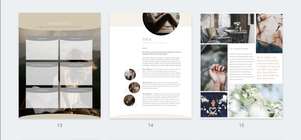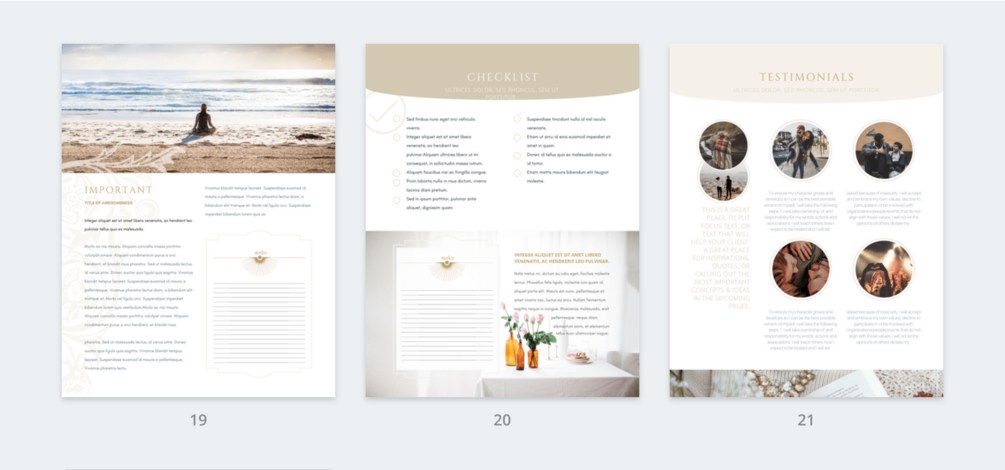 1x cover design, 1x brand style overview (complete with colours, fonts and style-board), 1x table of contents page, 1x quote page, 2x checklist page design, 5x worksheet pages, 7x content layout pages (including exercise sheets, callout designs and more!). 1x testimonial page 1x welcome page 1x credits page