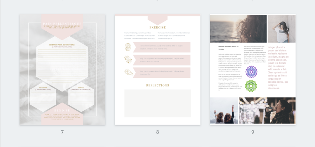 1x cover design, 1x brand style overview (complete with colours, fonts and style-board), 1x quote page, 3x checklist/needs assessment page design, 7x worksheet pages, 5x content layout pages (including exercise sheets, callout designs and more!). 1x team info/testimonial page 1x welcome page