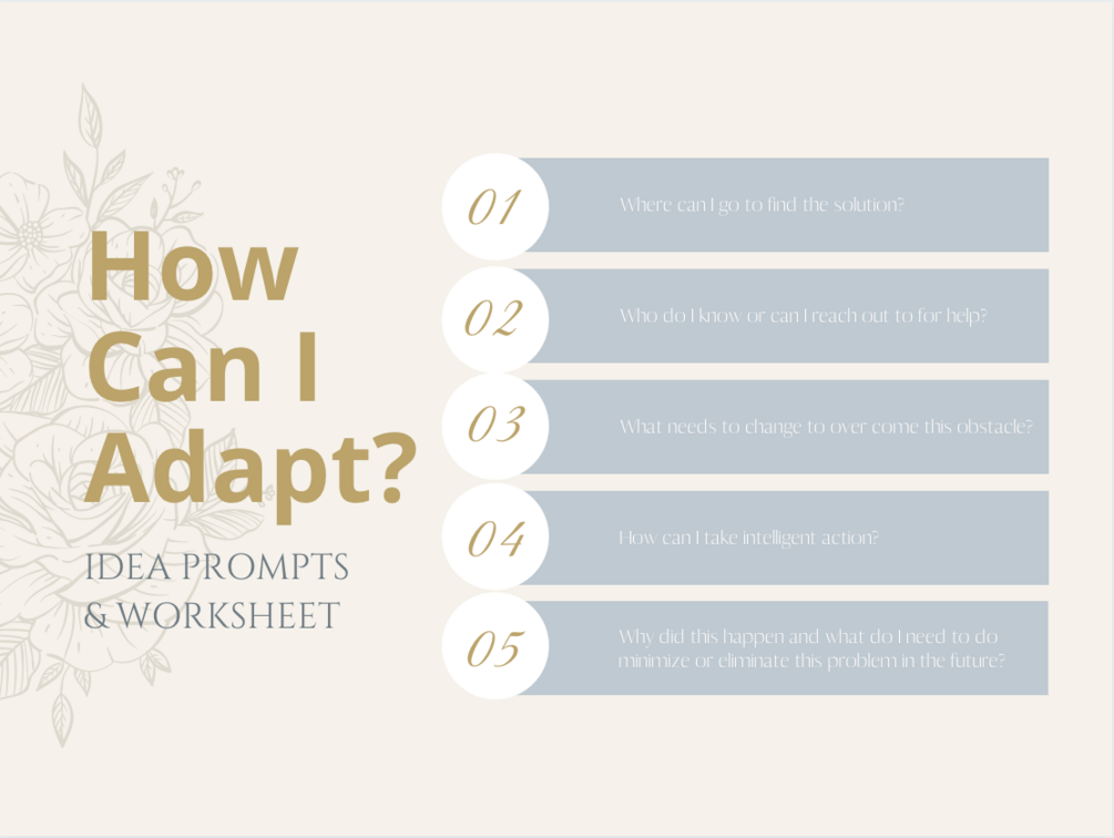 Easy-to use worksheet and idea prompts to assist you or your clients in dealing constructively with changing circumstances in relation to goals and plans. This version has a blank version of the worksheet.