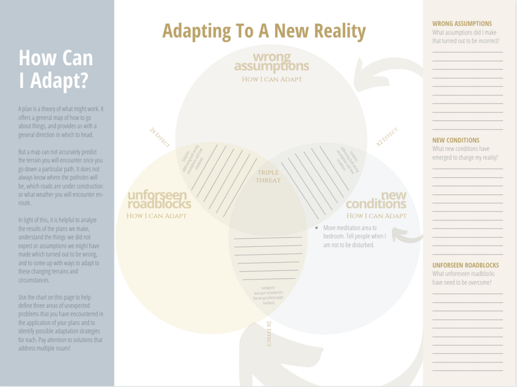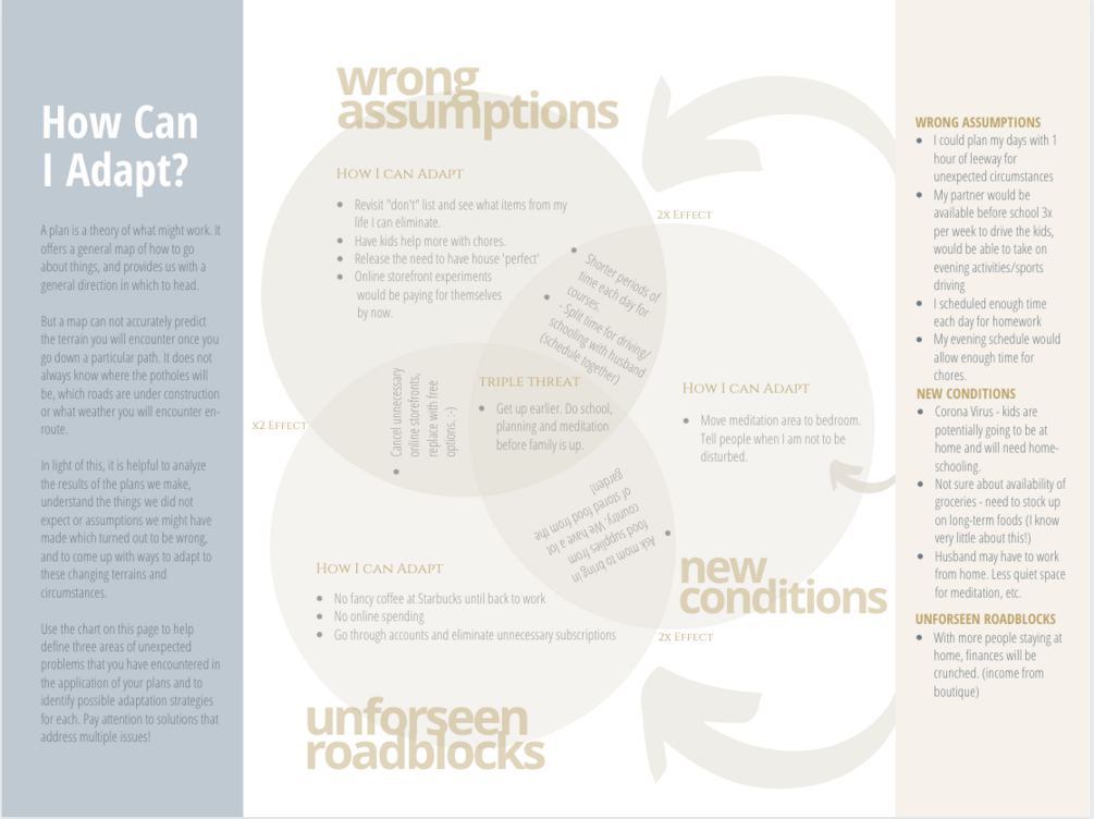 Easy-to use worksheet and idea prompts to assist you or your clients in dealing constructively with changing circumstances in relation to goals and plans. This version has a blank version of the worksheet.