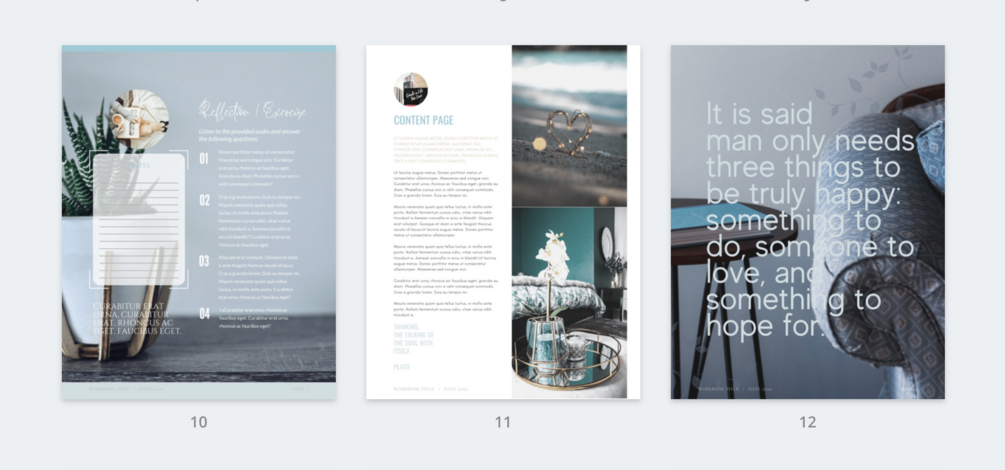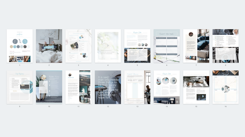 Stop wasting your time creating beautiful designs for your brand and spend your skills creating content! This beautiful workbook template made using calming blue tones includes 16 pages to get you going and give you a beautiful home for your ideas.